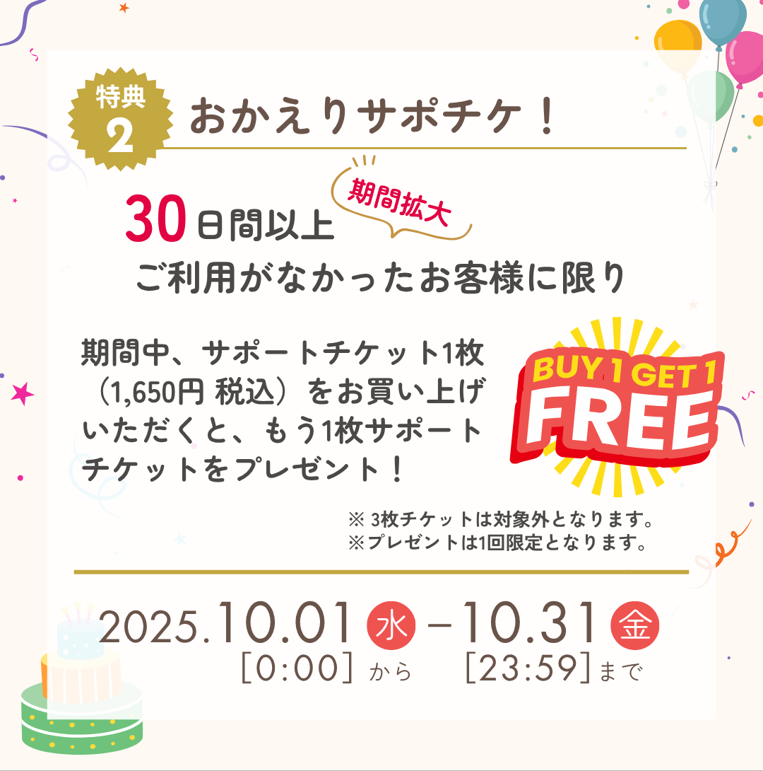 30日間以上、ジムのご利用がなかったお客様に限り、サポートチケット 1枚をご購入いただくと、なんともう1枚サポートチケットをプレゼント!