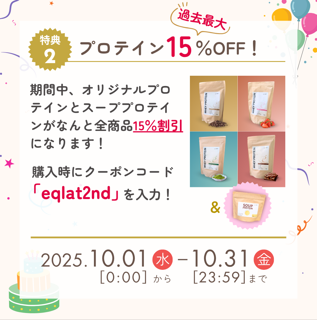 期間中、eqlat fitness オリジナルプロテインをご購入の方は15%OFF!